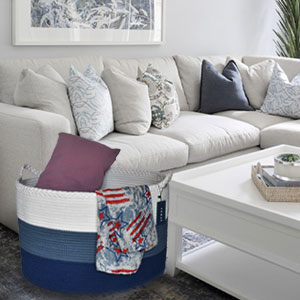 COMSE Extra Large Blanket Basket, Storage Basket, Laundry Basket, 21.7”x 13.8”, Laundry Hamper, Cotton Rope Basket, Blanket Basket Living Room, Toy Basket (White & Cadet Blue & Navy Blue)